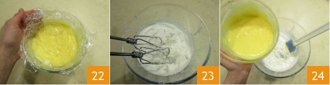 Mix well to combine everything, cover again with the film 22, and let it cool completely. Once the cream is cold, whip the cream 23. Then add the cream to the whipped cream in two portions 34