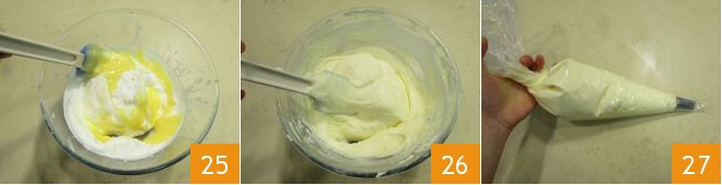 mixing with a spatula from bottom to top 25, to avoid deflating the mixture. Once you have a fluffy cream 26, transfer it into a piping bag 27 and store it in the refrigerator.