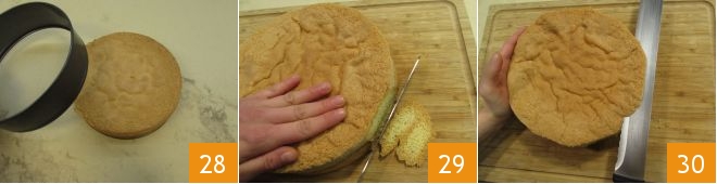 In the meantime, the sponge cake will have cooled; unmold it 28 and clean it from the outer crust, both around the circumference 29 and on the surface 30.