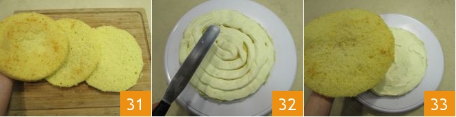 Using a long serrated knife, cut the sponge cake into 3 disks of the same thickness 31. Place the first on a serving plate and spread about 1/3 of the cream evenly over it 32. Cover with the second layer of sponge cake 33