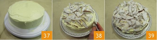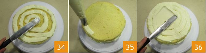 and add another layer of cream 34. Place the last disk and spread the remaining cream both on the surface and the edges 35, and using a spatula, level the cream 36
