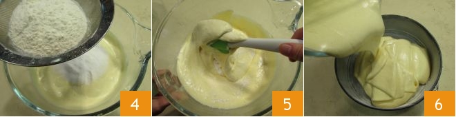Then turn off the machine and sift the flour and potato starch directly into the bowl 4. Then gently mix with circular motions from bottom to top 5. Once you have a uniform mixture, transfer it into a previously buttered and floured 9.5-inch mold 6.