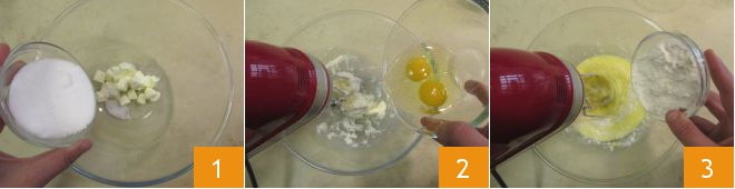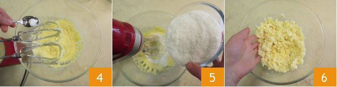 To prepare the coconut cookies with a white chocolate heart, put the soft butter in pieces and the sugar in a bowl 1, beat the ingredients with electric beaters, and then add the eggs, one at a time 2. Once you have obtained a homogeneous mixture, add the sifted flour 3.