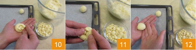 Stuff with some white chocolate chips, about 0.1 oz 10, and wrap the filling with the dough 11, recreating the initial ball 12.
