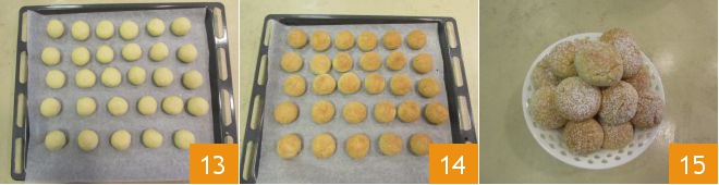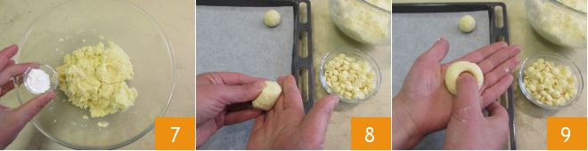 Finally, add the baking powder 7 and mix the dough one last time. Now take a small portion of dough about the size of a walnut, weighing approximately 0.7 oz, form balls with your hands 8, then create an indentation by pressing with your thumb in the center of the ball 9.