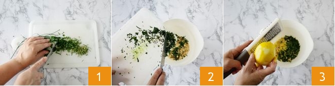 To prepare the cod and speck bites, first prepare the chopped aromatic herbs 1 and mix them in a bowl with the crumbled bread crumbs 2. Then add the grated lemon zest 3 and mix everything together.