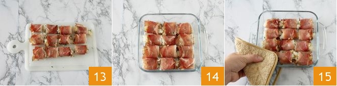 to cover them completely 10. Lay the slices of speck on a cutting board and place each bite at the beginning of one of the slices 11. Roll up to get a roll 12.