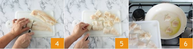Take the cod fillets and cut them first into strips 4 and then into cubes, not too small 5. Pour a drizzle of oil into a pan, heat it, and add the cod 6. Let it brown on both sides for a total of 5 minutes, turning them gently.