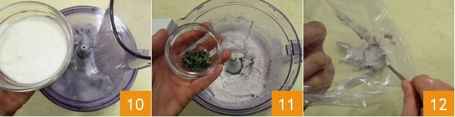 Keep the blender running while adding the plain yogurt 10, and blend until you obtain a smooth and whipped cream. Add the thyme leaves 11. Transfer the mixture into a pastry bag fitted with a fluted nozzle 12 and let it rest in the fridge for at least 10-15 minutes.