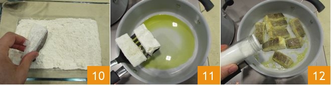 Carefully flour the cod chunks 10, then heat a drizzle of oil in a pan and place the cod 11 browning it on both sides for a few moments, gently turning it, salt 12, and pepper.