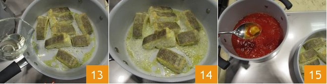 Deglaze with white wine 13 and let it evaporate 14. Meanwhile, the sauce will be ready, now you can remove the garlic 15,