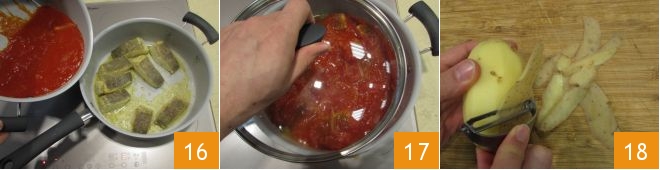then pour the sauce into the pan with the cod 16, cover with the lid 17 and let it cook gently for about 20 minutes, if you stir, do it very gently to avoid breaking the cod. Meanwhile, peel the potatoes 18.