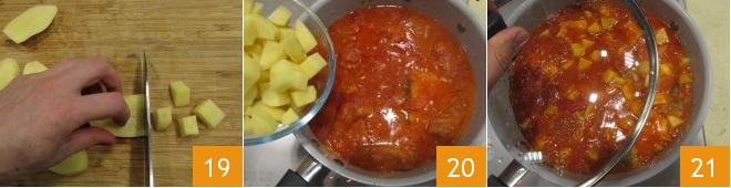 and cut them into cubes 19. After the 20 minutes of cooking the cod, also add the potatoes 20, cover with the lid 21, and continue cooking for another 20 minutes, always being careful to stir so as not to break the cod too much.