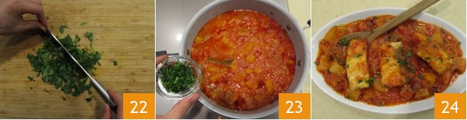 Wash and chop the bunch of parsley 22, once the cod is cooked, turn off the heat and flavor with the chopped parsley 23. Serve your Livorno-style cod piping hot 34.