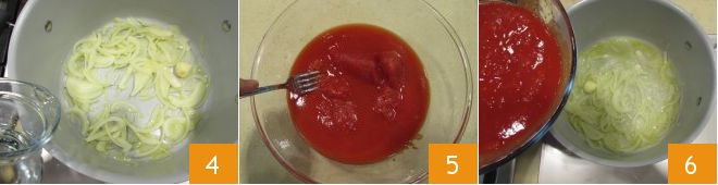 Let them wilt for 3-4 minutes over low heat, moistening with a little water 4, just enough to prevent the soffritto from drying too much. In a bowl, crush the peeled tomatoes 5, then pour them into the pan with the onions 6.