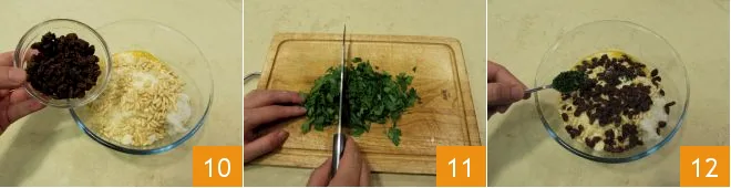 Add the raisins to the other ingredients 10. Finely chop the well-rinsed and dried parsley 11 and add it to the bowl as well 12.