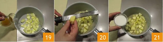 Sprinkle with the grated cheese 16 and bake in a static oven preheated to 340°F for 50-55 minutes (if using a fan oven, 300°F for 40-45 minutes will suffice). While the cod terrine is in the oven, focus on the apple sauce: cut them in half 17 and peel them. Cut them into wedges and then into cubes 18.