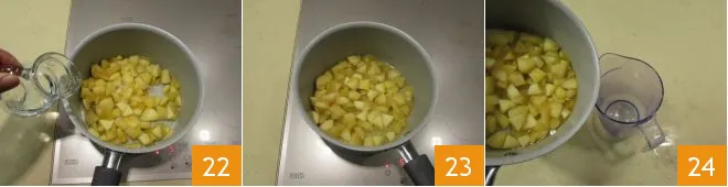 Add the water and let it cook for about a few minutes until the water is almost completely absorbed 23. Continue to stir to blend the ingredients and flavors. The apples at the end of cooking should be well cooked and very soft. Then transfer them to a narrow, high-sided container 34.