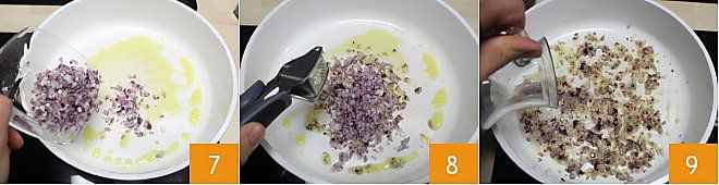 add the previously chopped onion to brown 7. Crush the garlic clove directly in the pan 8 and sauté over medium heat for at least 10 minutes. Add water to the sauté to prevent it from drying out too much 9.
