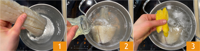 To prepare the codfish salad, first bring a pot full of water to a boil and immerse the whole cod fillet 1. Add the white wine 2 and lemon zest 3.