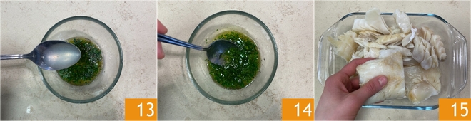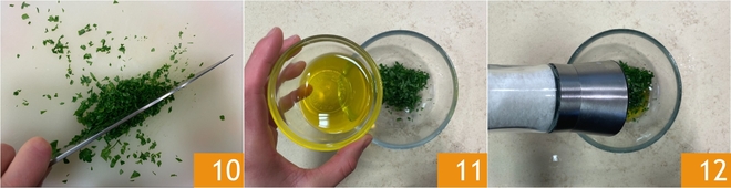 Move on to the parsley sauce: finely chop the parsley 10, then transfer it to a small bowl and add the oil 11, salt 12, and pepper.