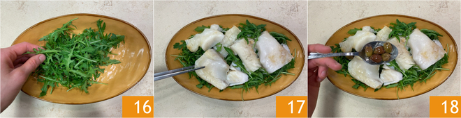 You are ready to assemble the salad: spread a bed of arugula on the serving platter 16, then place the cod on top 17 and distribute the Taggiasca olives 18.