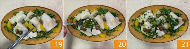 Add the orange segments 19 and finally drizzle with the parsley sauce 20. Your codfish salad is ready to be enjoyed 21!