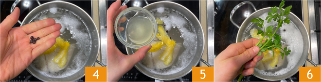 Also flavor with juniper berries 4, lemon juice 5, and parsley 6.