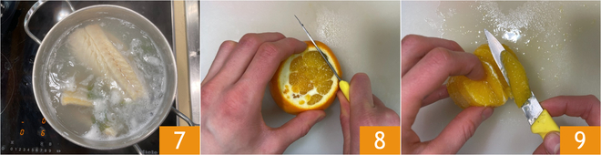Cook for about 35 minutes 7. Meanwhile, peel the oranges, removing the peel 8 and extracting the segments without the white part 9.
