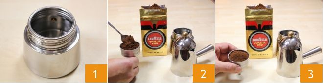 To make the coffee cream with almond biscuit, start by preparing the coffee with the moka pot: fill the boiler with cold water, preferably low in limestone, up to the safety valve 1 (otherwise you will get a longer coffee). Fill the filter with ground coffee 2 and level with each teaspoon of coffee added by tapping the filter on the table with decisive movements 3, until you reach the edge of the filter.