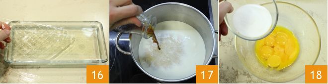 Now take care of the cream: start by soaking the gelatin sheet in cold water for 5-10 minutes 16. While the gelatin softens, pour the fresh cream and milk into a saucepan, add the previously prepared moka coffee 17, and let it almost reach boiling point, meanwhile beat the eggs with sugar in a bowl 18