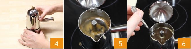 Do not press with the teaspoon, nor make holes, and screw the coffee maker tightly 4 (to prevent coffee from spilling out the sides while it rises), then place it on a low and steady flame to obtain a full-bodied coffee. As the coffee rises, a dense froth will form 5; we recommend not letting the coffee gurgle for too long to keep its aroma and sweetness intact. Then turn off the heat, and your coffee for the preparation is ready: stir it directly in the moka pot with a teaspoon to make it more homogeneous 6.