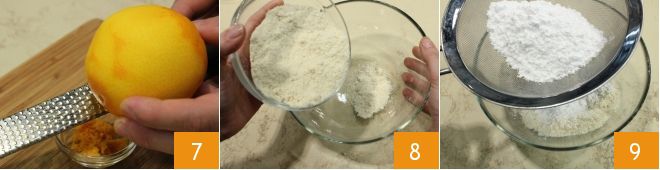 Let the coffee cool and start preparing the biscuit: grate the zest of an orange 7 and set it aside. In a bowl, pour the chopped almonds 8, add the sifted powdered sugar 9, flavor with the grated orange zest and a teaspoon of honey, and finally add an egg white and a pinch of salt.