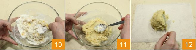 At this point, mix the mixture with a spoon 10 until you get a compact and well-mixed dough 11. Place a sheet of parchment paper on a pastry board, transfer the dough onto the sheet with a spoon 12
