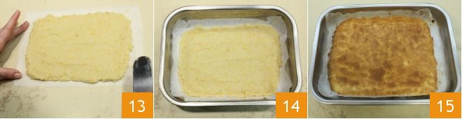 and spread it out into a rectangular shape of about 7 x 10 inches 13. Transfer the biscuit base into a slightly larger rectangular baking pan 14 and bake in a preheated static oven at 355°F for 15 minutes (or in a fan oven at 320°F for about 10 minutes). When the surface of the biscuit is golden, remove it from the oven and let it cool 15.