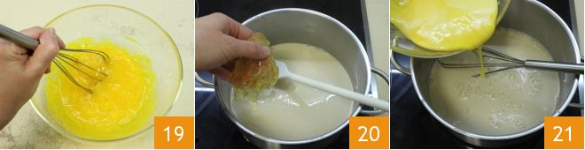 until you create a homogeneous mixture 19. Then turn off the heat, drain the gelatin, squeeze it, and add it to the hot mixture 20. Stir with a whisk to dissolve the gelatin better and add the eggs with sugar 21.