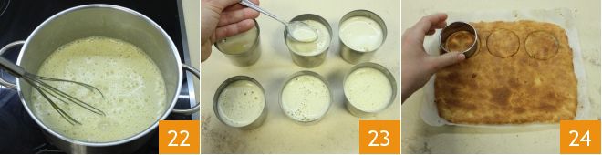 Mix well with the whisk to combine the mixture 22 and finally add a pinch of salt. Then divide the obtained cream into 6 single-serving molds with a capacity of ½ cup each 23 and let the cream set in the refrigerator for at least 4 hours. After this time, take the now cold biscuit base and cut out 6 discs with a round cutter with a diameter of 3 inches 34.