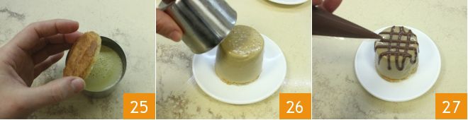At this point, you can assemble your dessert: remove the creams from the refrigerator, place a biscuit on the surface of the cream 25 and unmold the dessert, to facilitate this operation, dip it for a few moments in a bowl containing hot water 34 and then turn it onto a serving dish 26. Finally, garnish the dessert with a coffee-flavored ganache; to make it, follow the recipe for the Ganache cream by adding the moka coffee to the preparation, once ready, transfer it to a piping bag with a narrow nozzle to create striped patterns on the surface 27. Your coffee cream with almond biscuit is ready to be enjoyed!