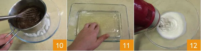 To stop the cooking, immerse the saucepan in a bowl with ice water 10. Stir the cream quickly until it is no longer hot; it should be around 122°F. Set aside for a moment and soak the gelatin in cold water 11. Pour the cold heavy cream into a bowl and whip it with electric beaters 12,