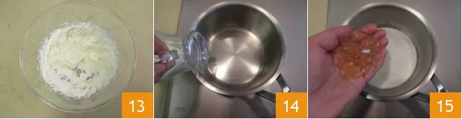 until you have obtained a frothy consistency 13. Pour the remaining 1/6 cup of milk into a saucepan 14, heat it, and as soon as it reaches a boil, turn off the heat. Drain the gelatin, gently squeeze it, and pour it into the milk 15.