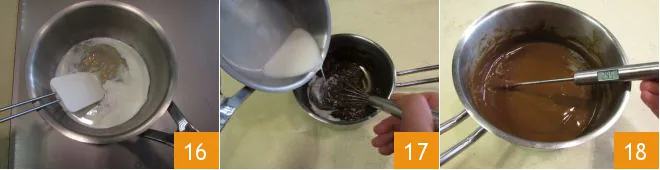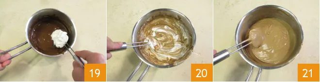 Stir until it is completely dissolved 16, then pour everything into the saucepan with the coffee cream 17, continuing to stir with a whisk to incorporate it. When the cream reaches a temperature of 86°F, you can incorporate the whipped cream.