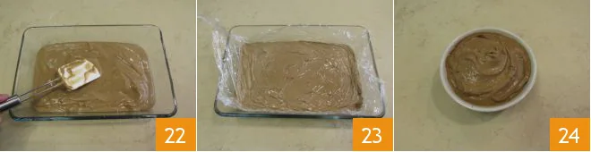 Transfer the coffee diplomatic cream into a baking dish 22, cover with plastic wrap in contact 23, and let it cool in the refrigerator before using it 34.