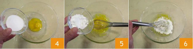 In a bowl, pour the egg yolks and the sugar 4 and beat with a whisk. Add the cornstarch 5 and stir again 6 until you get a lump-free mixture.