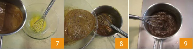 Gradually add the coffee milk into the bowl with the yolk mixture 7, stir, and pour back into the saucepan 8. Bring it back to the heat until the cream has thickened 9. It will take a couple of minutes.