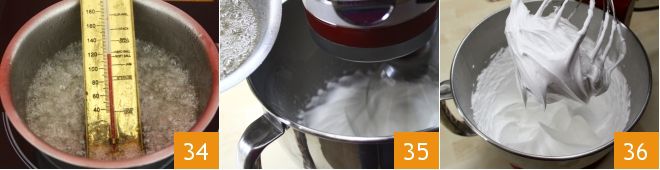 Finally, prepare the Italian meringue. Pour the sugar and water into a saucepan, heat over low heat until the sugar dissolves, when the syrup starts to boil, insert the thermometer until it reaches 348°F 34. Meanwhile, whip the egg whites with a few drops of lemon juice and when the syrup reaches the indicated temperature, pour it slowly into the egg whites while continuing to whisk 35. When the meringue is dense and smooth 36