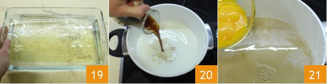 Now take care of the cream. Take a bowl, fill it with cold water and soak the gelatin 19. Then take a pot and pour in the milk, the coffee from the moka 20, the egg yolks 21 and