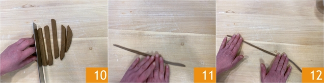 Then cut strips with a knife 10. Now clean the work surface from the flour and gently roll the strips of dough to obtain long "spaghettoni" about 1/4 inch in diameter 11 12.