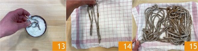 As you form them, pass them through the flour to prevent them from sticking together 13 and place them on a well-floured tray 14. Continue until you have used all the dough, taking care not to pile the pici and not to overlap them to avoid ruining their shape 15. Keep them aside in a cool place.