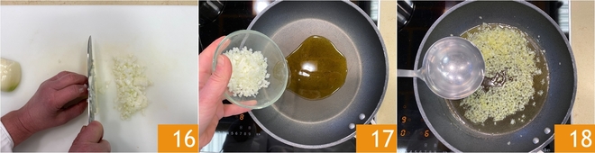 Proceed to the pea sauce: finely chop the onion 16 and let it soften in a saucepan with a drizzle of oil 17 for a few minutes, stirring often and adding a little hot water 18.