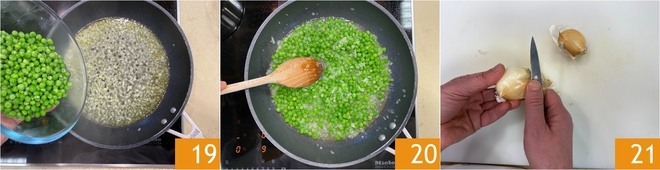 When the onion is soft, add the peas 19, pour in 2 ladles of water and cook over medium heat for about 10 minutes 20. Meanwhile, peel the garlic 21.